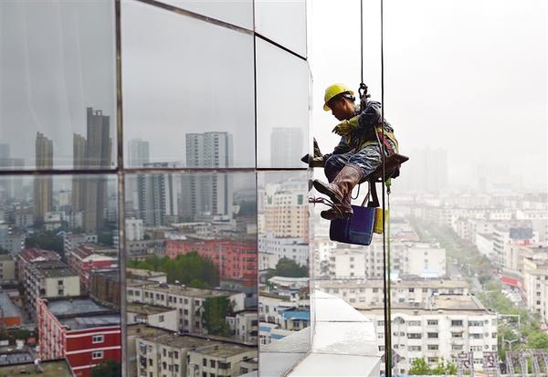 近日,一名“蜘蛛人”在中心城區(qū)一座大樓的外墻面認(rèn)真作業(yè),為城市的美麗和整潔貢獻(xiàn)著自己的力量